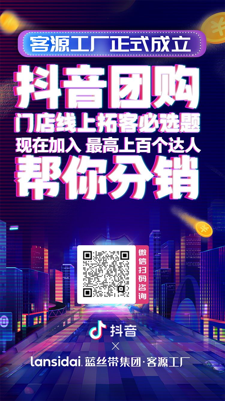 【蓝丝带抖音】 客源工厂正式成立 抖音团购 门店线上拓客必选题 现在加入 最高上百个达人 帮你分销 立即微信扫码咨询